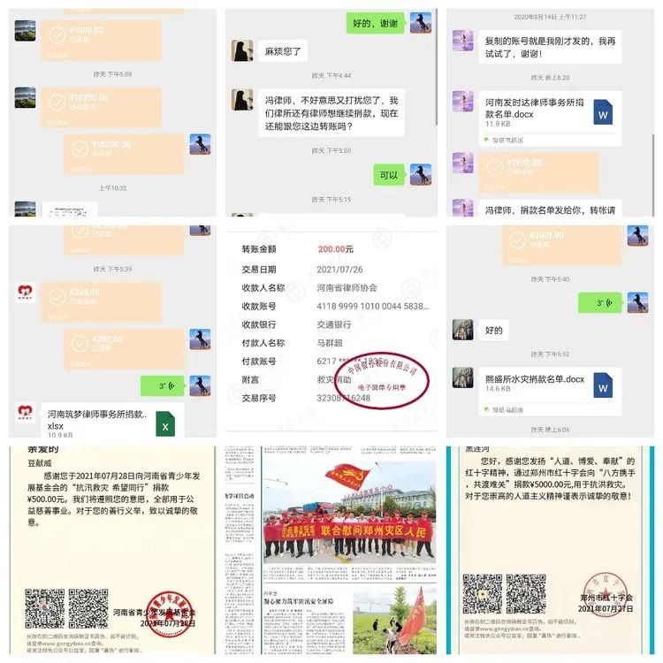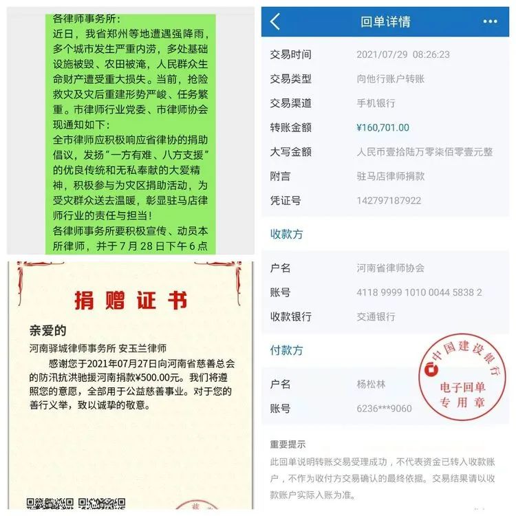 7月29日上午,驻马店市律师协会秘书处将汇聚着全市律师对灾区群众关心与祝福的捐款160701元汇款至河南省律师协会,为助力打赢抗洪救灾战役献上了天中律师的力量,充分彰显了天中律师的社会担当与情怀!