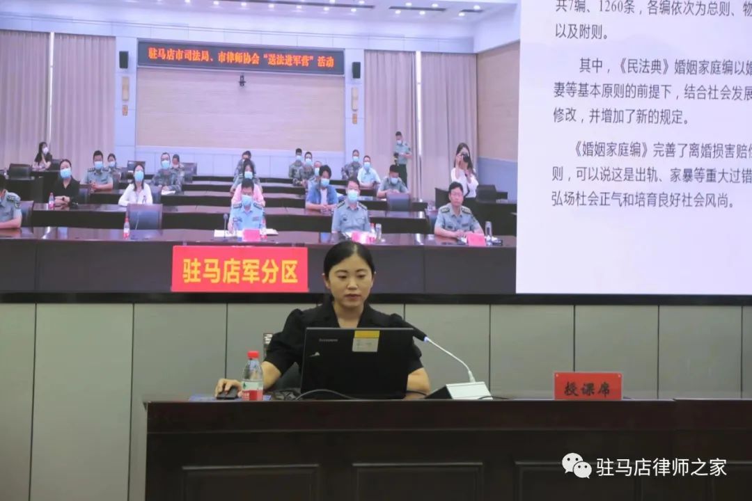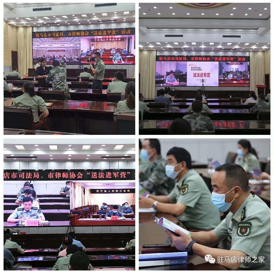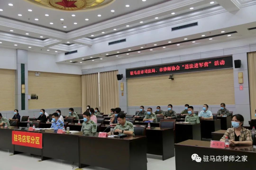 送法进军营 普法入军心——驻马店市司法局、市律师协会联合开展“送法进军营”活动 添加时间:2022-09-06 10:10:07 律管平台 阅读:2979 来源:admin 为发挥我市司法行政职能优势和律师专业优势,密切军民关系,增进军民感情,提高我市部队官兵依法维权的法律意识,切实维护军人的合法权益,8月12日,市司法局宣传科科长姚雪荣、市律师协会副会长周晓华带领市律师协会女工委的同志,走进驻马店军分区,开展民法典主题宣讲活动。军分区干休所、各县区人民武装部等12个分会场以视频会议形式参会,此次活动由军分区政治部主任杨峰主持。