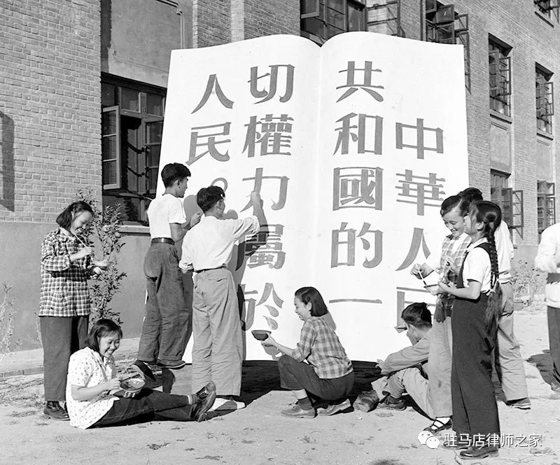 1954年9月20日,第一届全国人大一次会议通过、颁布了《中华人民共和国宪法》,这是中国历史上第一部社会主义宪法。图为北京政法学院的同学们,以欢乐的心情赶制国庆节游行用的巨大模型,庆贺中华人民共和国宪法的诞生。新华社记者 毛松友/摄