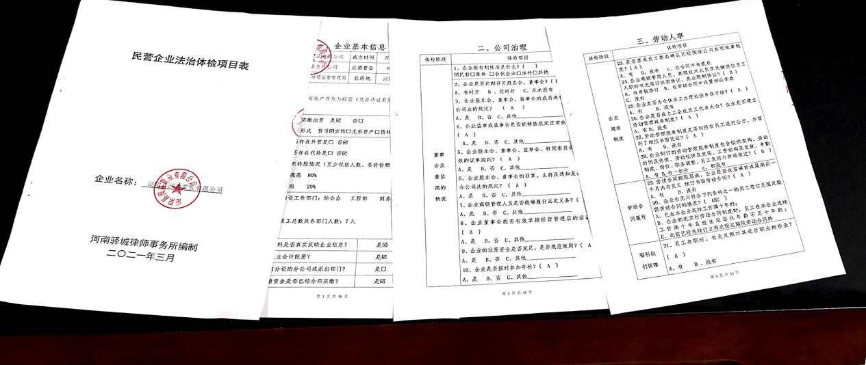 为开展好这次活动,驿城所民营企业法律体检服务团进行了精心准备。根据公司法、税法、民法典、环境保护法、建筑法、城市房地产管理法、劳动合同法等相关规定,针对企业公营管理方方面面的问题编制了多达145个小项的体检项目表,以便体检过程中“对标对查”。